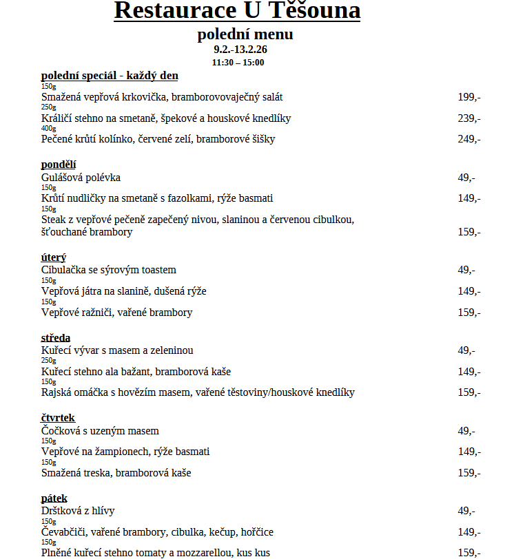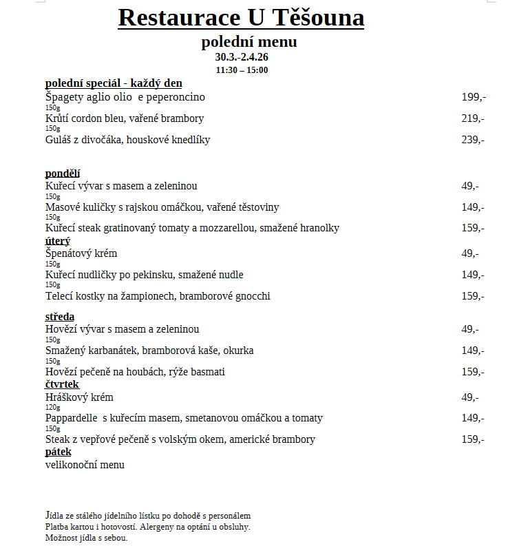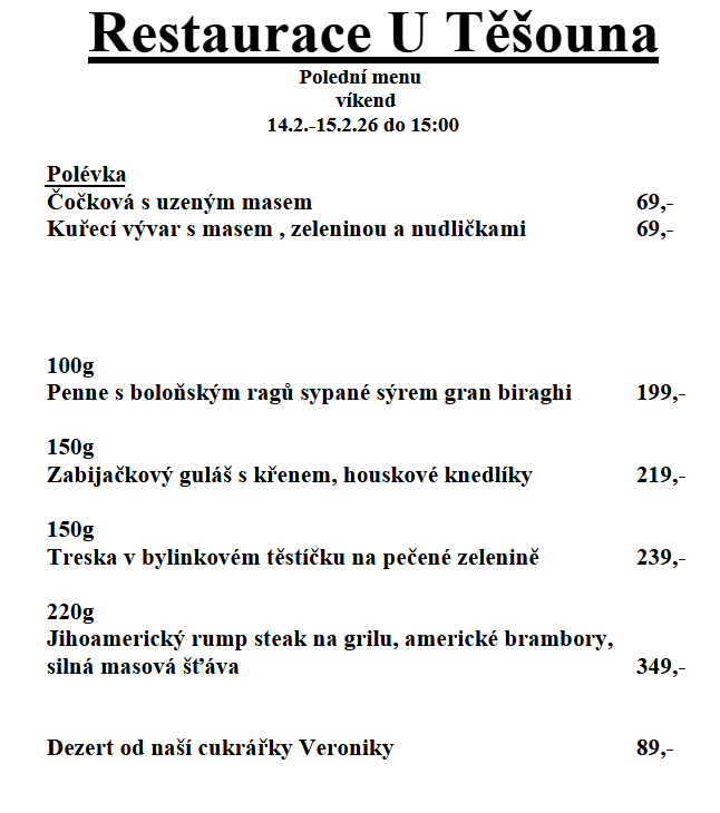 Rezervovat on-lineVychutnejte si vřelou atmosféru a pohostinnost restaurace U Těšouna v Kamenici. Vřele vás vítá! Nabídneme vám lahodné pokrmy české a mezinárodní kuchyně. Vychutnejte si chutné pivo, víno, kávu a čaj v našem příjemném prostředí k jídlu. Naši ochotní číšníci na vás čekají, aby vás potěšili chutným obědem a večeří.